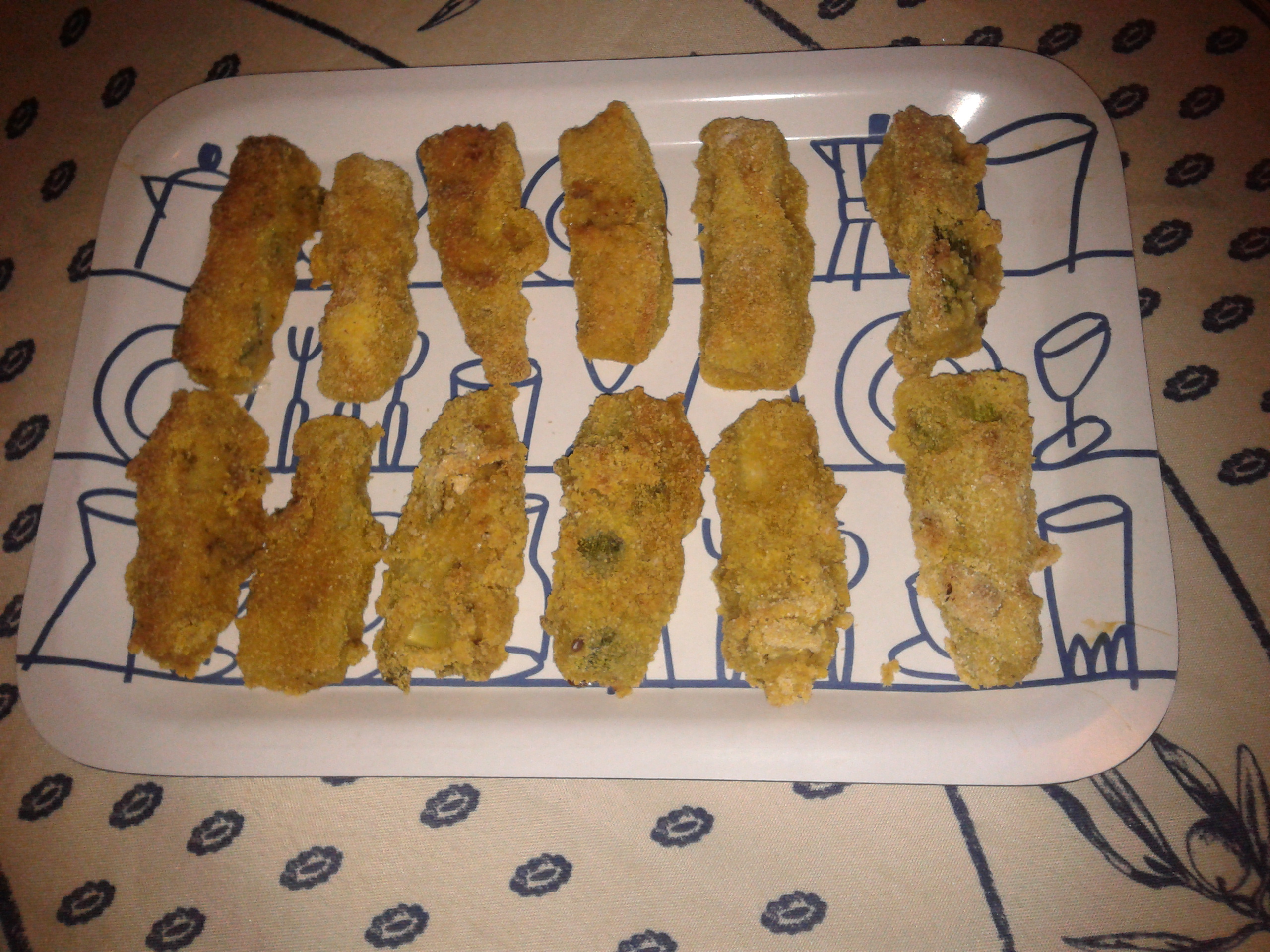 Passarle le zucchine tagliate, prima nella farina di farro, poi nella pastella, quindi nella farina di mais o (pan grattato).
