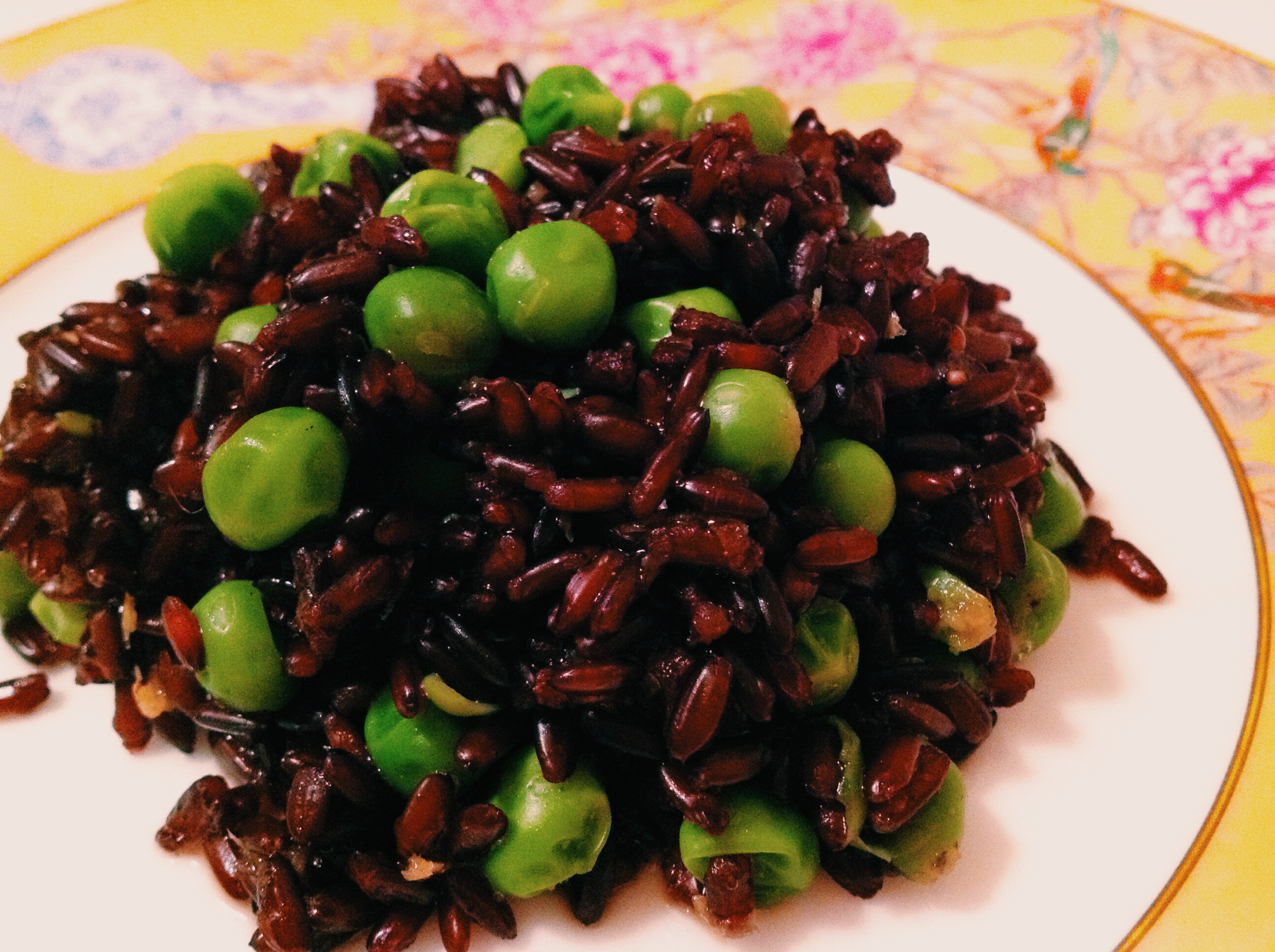 Riso (venere -quello nero- o integrale) + sale q.b + curcuma q.b. + zenzero + 1 porro + 100 gr di piselli + olio evo
