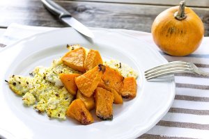 Puoi servirla sopra del tofu. Per farlo potresti usare questa ricetta e poi sbriciolare il tofu, ponendo sopra la zucca in cubetti, cospargendo sul tofu il prezzemolo tritato.